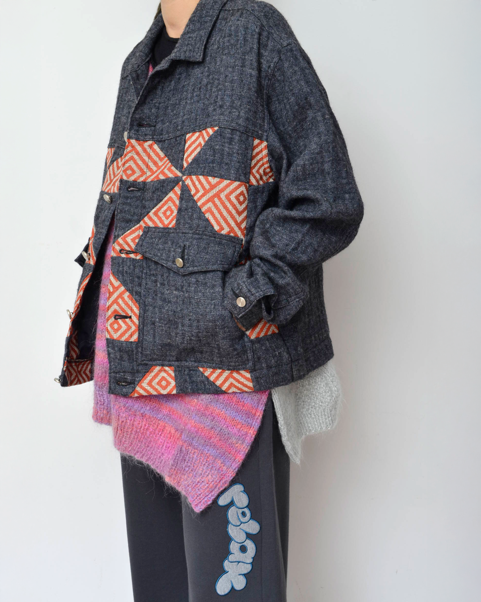 前身頃には、デッドストックのインテリアファブリックと合わせたキルト切り替えを施しています。