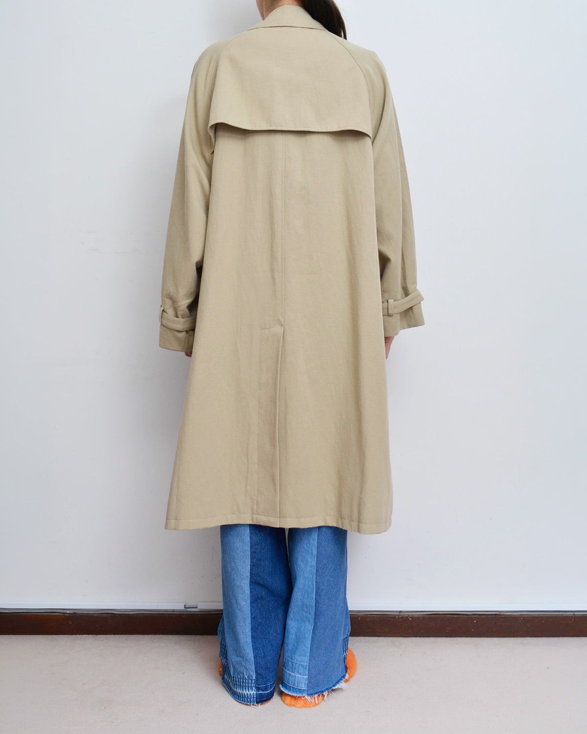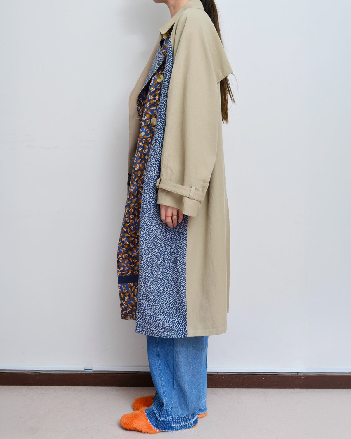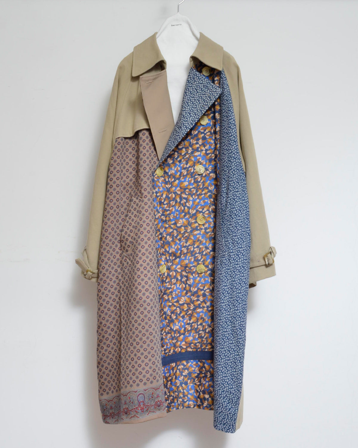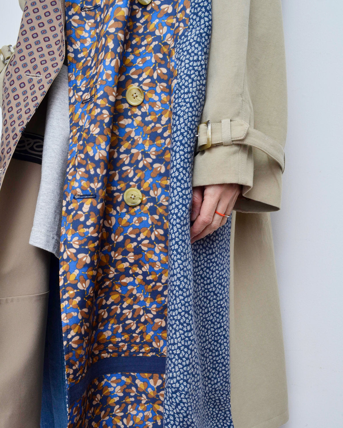 前身頃にusedフローラルスカートを解体して配したトレンチコート。
