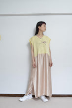 イエローが映えるused POLO ニットベストにシャイニーサテンをあわせたワンピース。