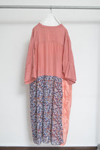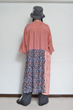 A long robe made with a new front made from used shirt fabric and combined with two types of used pleated skirts.