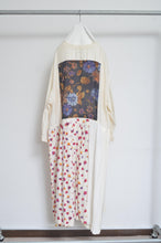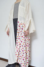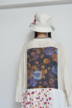 A long robe made with a new front made from used shirt fabric and combined with two types of used pleated skirts.