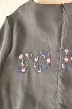 "fab-graph"(ファブグラフ)というYR!!独自の手法により、used花柄スカートを文字に切り抜き、プリントするかのように手縫い付けしたグラフィック。