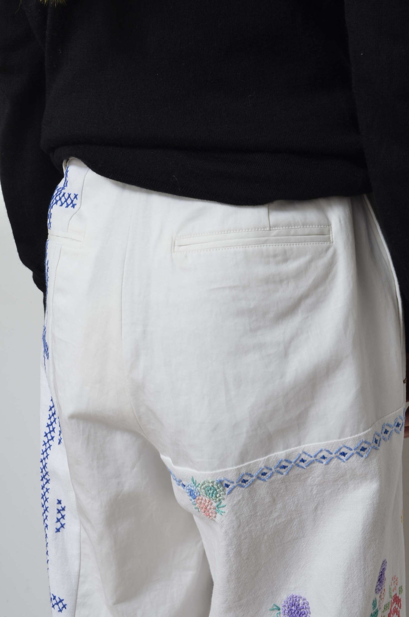 前開きはファスナーとホック。腰ポケットと後ろ玉縁ポケット付き。