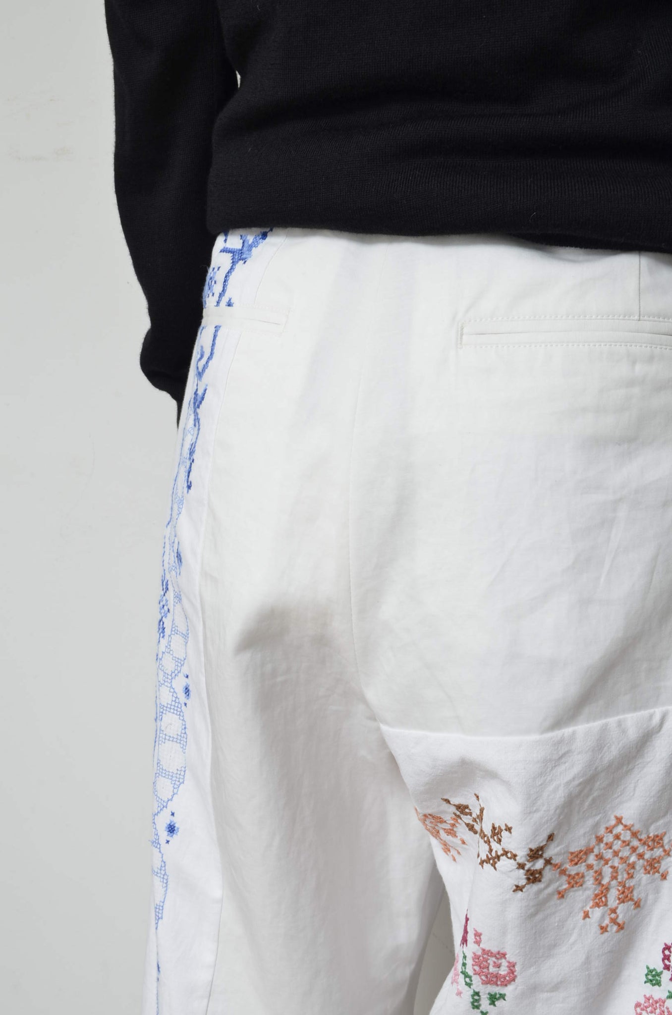 前開きはファスナーとホック。腰ポケットと後ろ玉縁ポケット付き。
