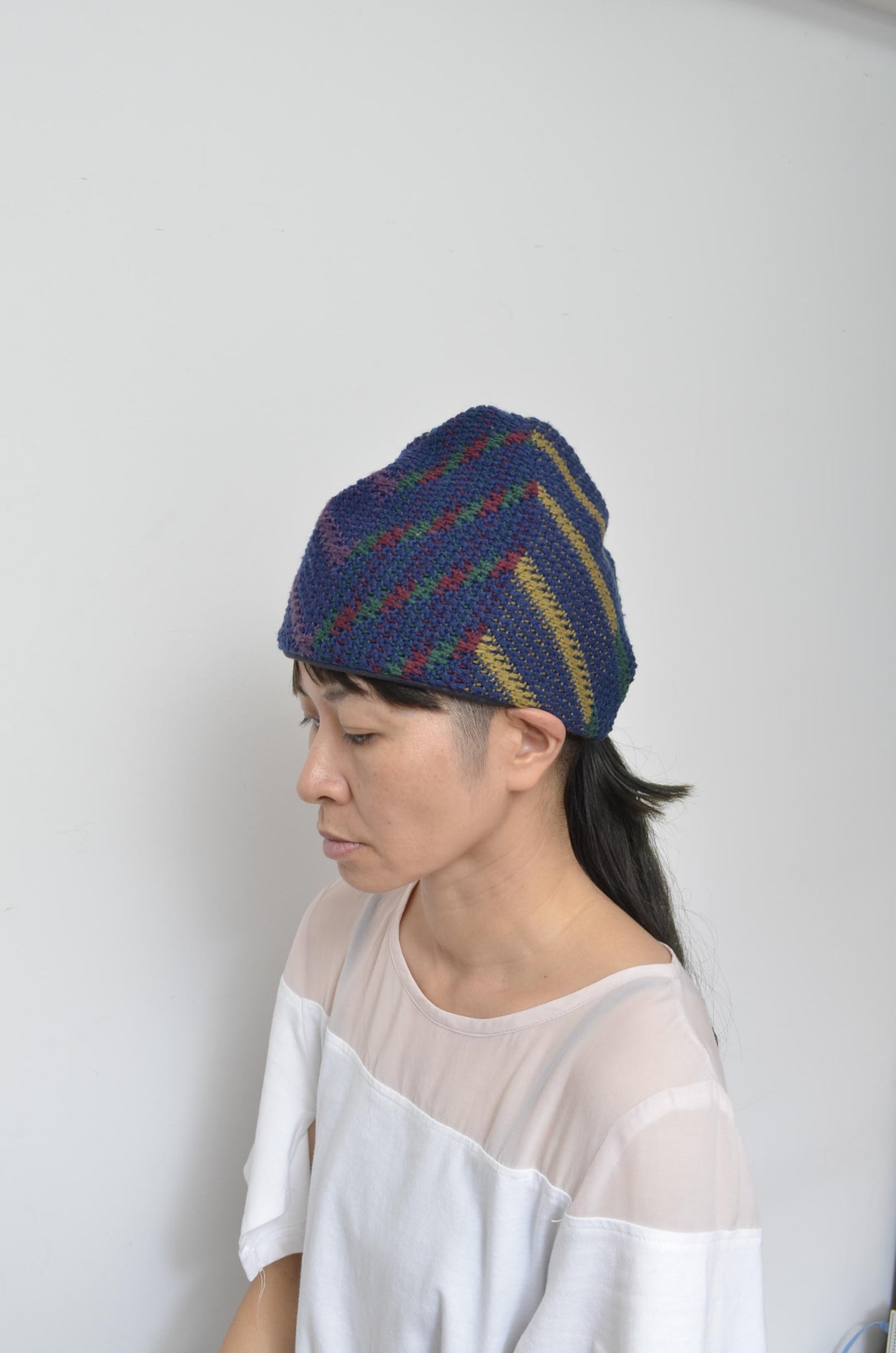 usedコスビーニットを解体し、オリジナルパターンで仕立てたニットキャップ。