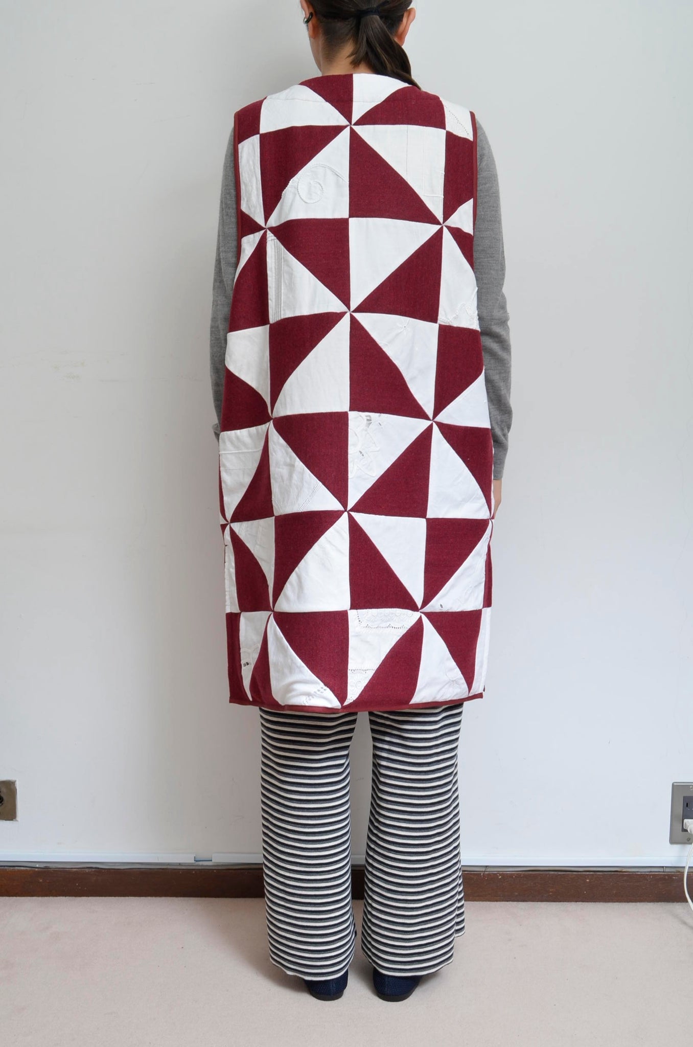 バックにはかつてARMANIで使われていたイタリア製のこの生地とusedテーブルクロスを合わせたキルト切り替えを施しています。
