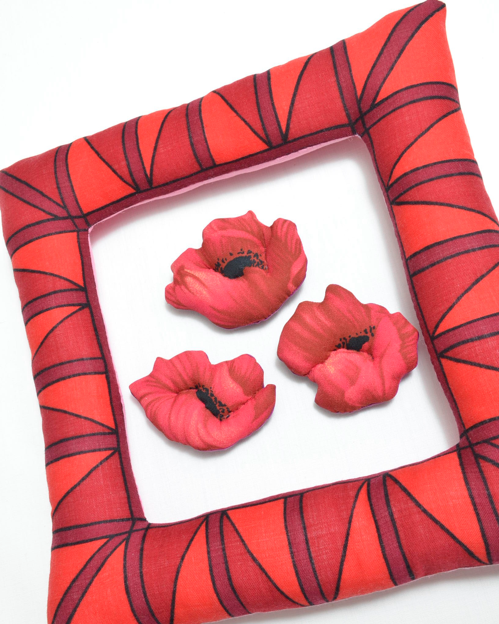 シャープな幾何学模様のフレームに、ポピーのブローチが咲いています。
