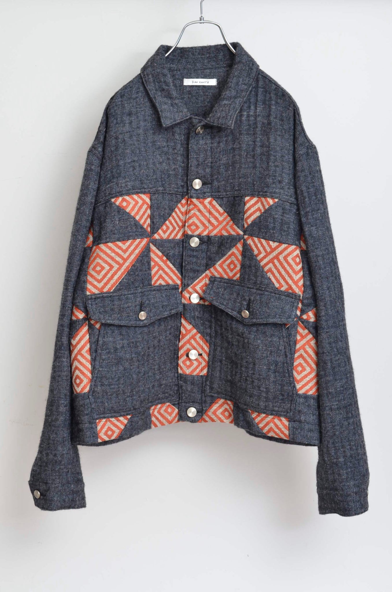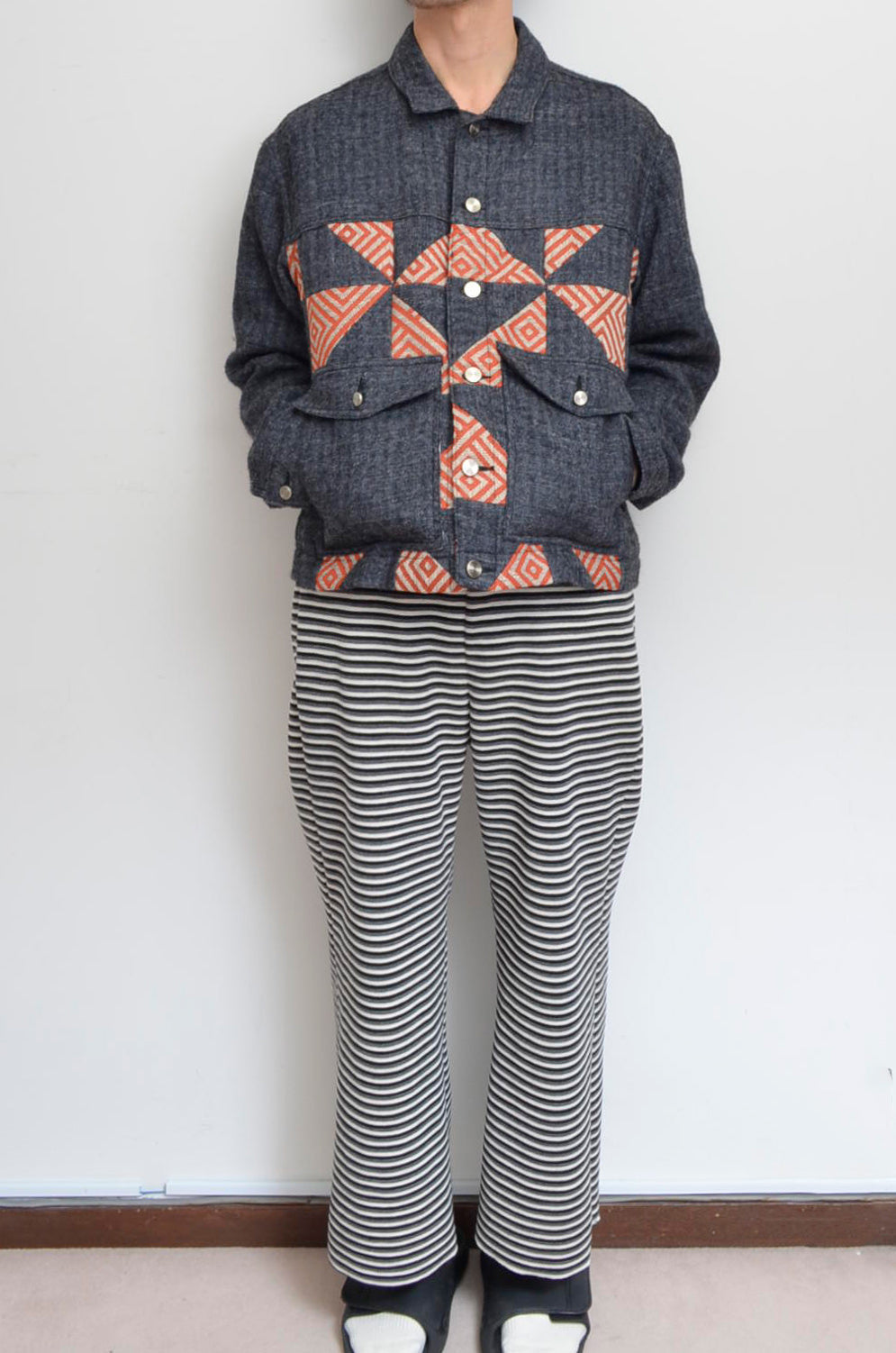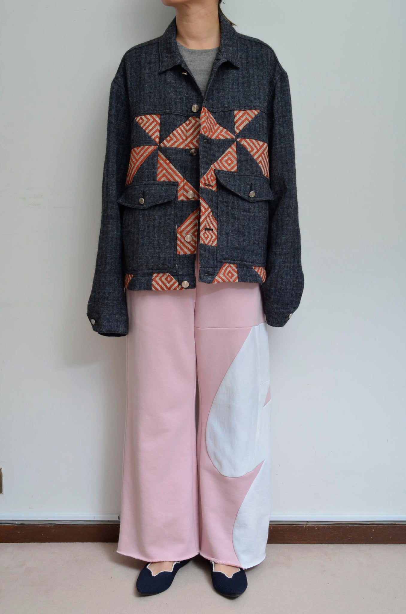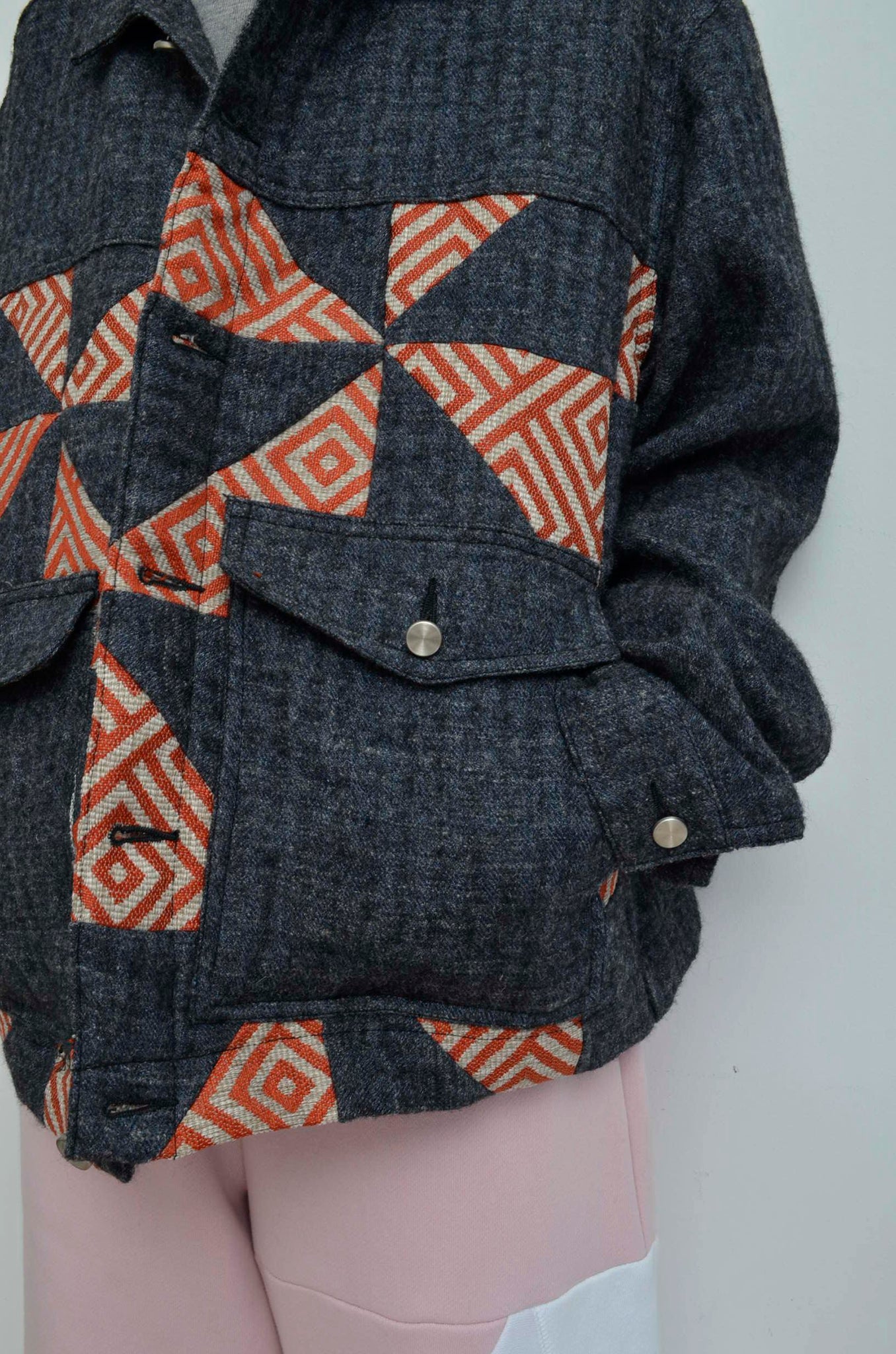 前身頃には、デッドストックのインテリアファブリックと合わせたキルト切り替えを施しています。