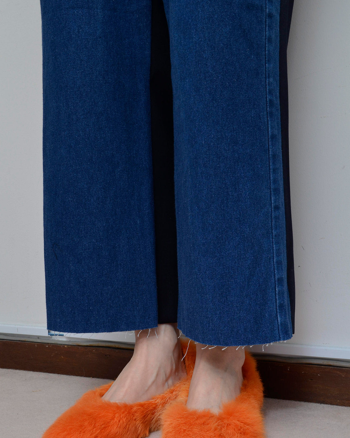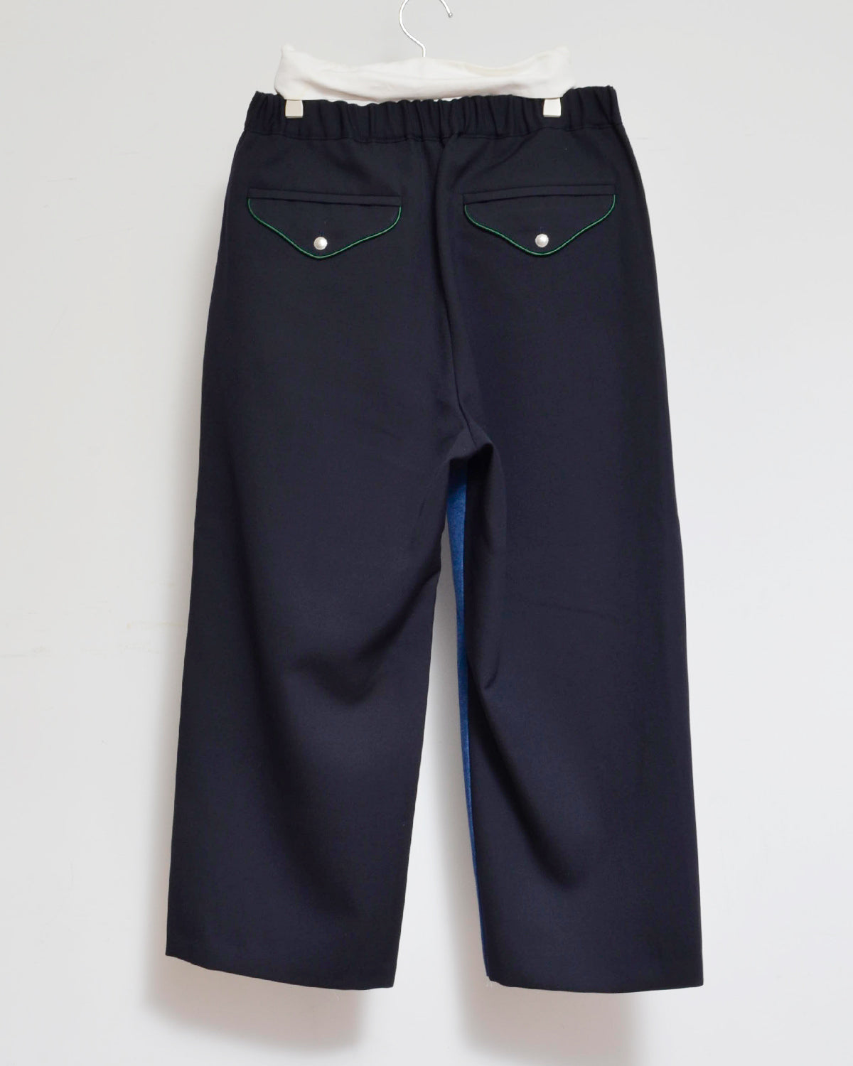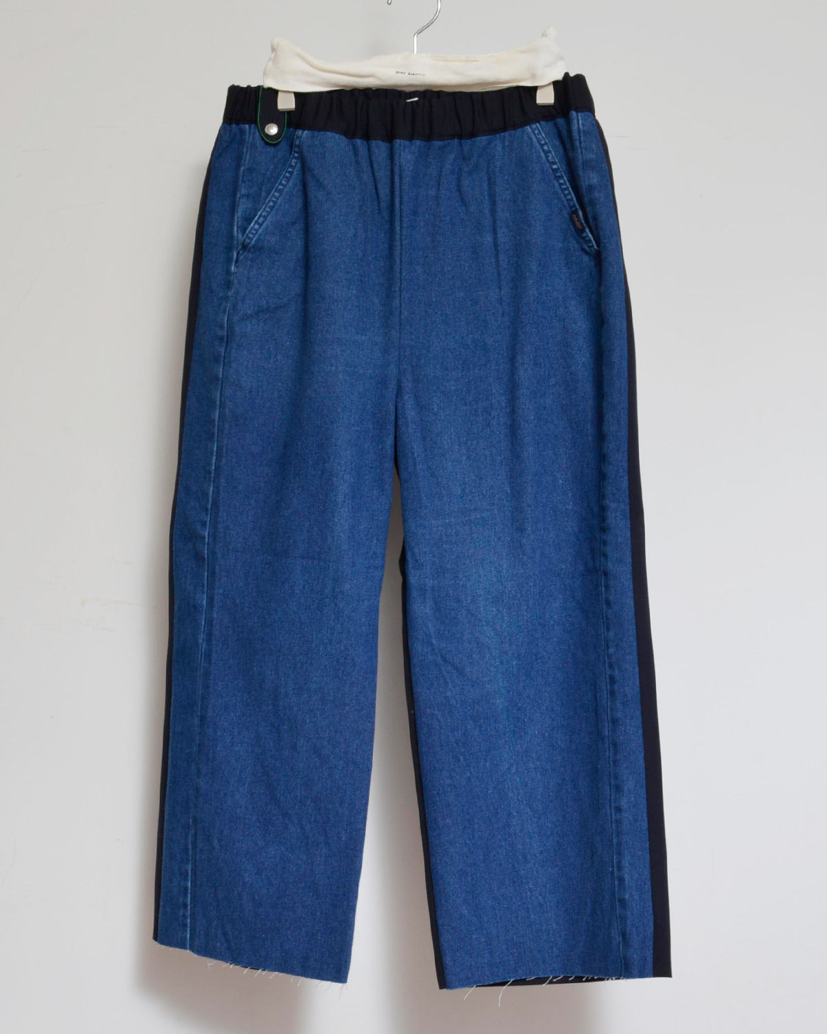 前身頃にはusedデニムのイージーパンツを大胆にそのまま使用し、ポケットも古着のディテールを活かしています。