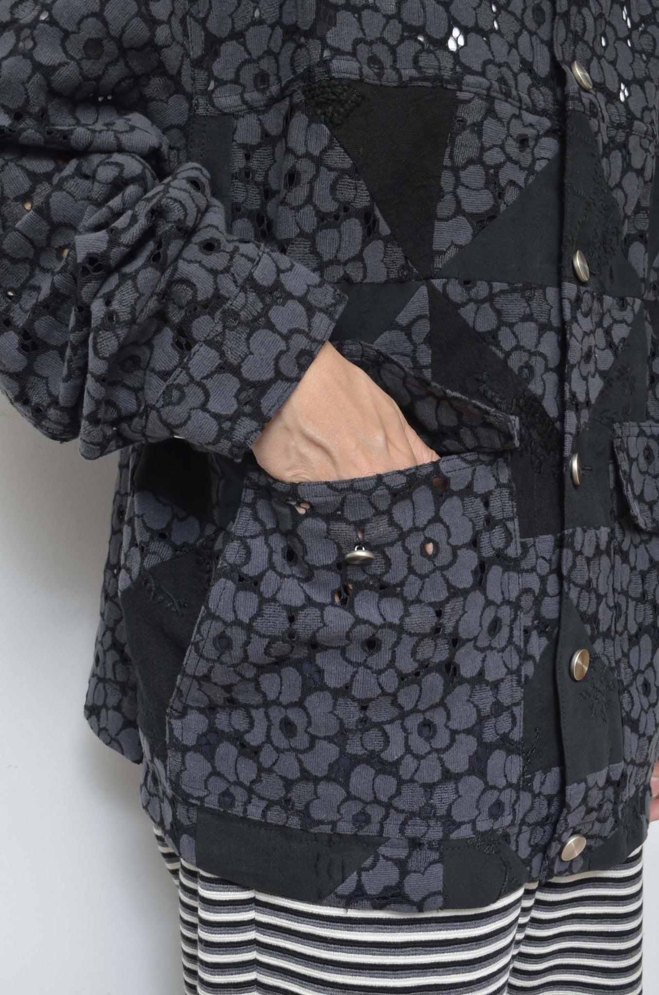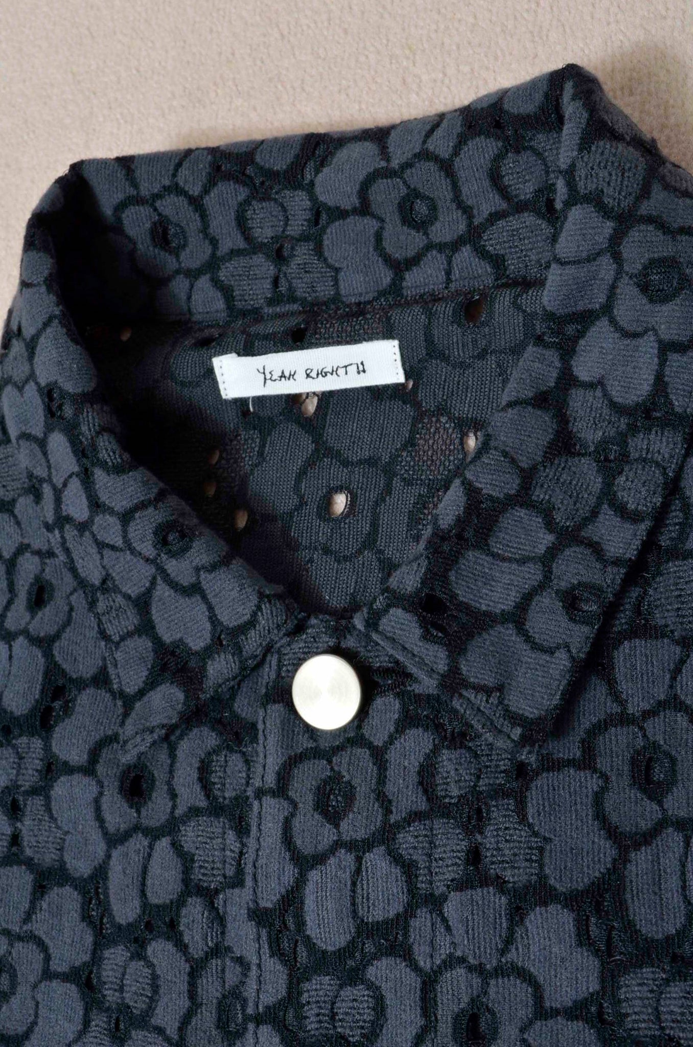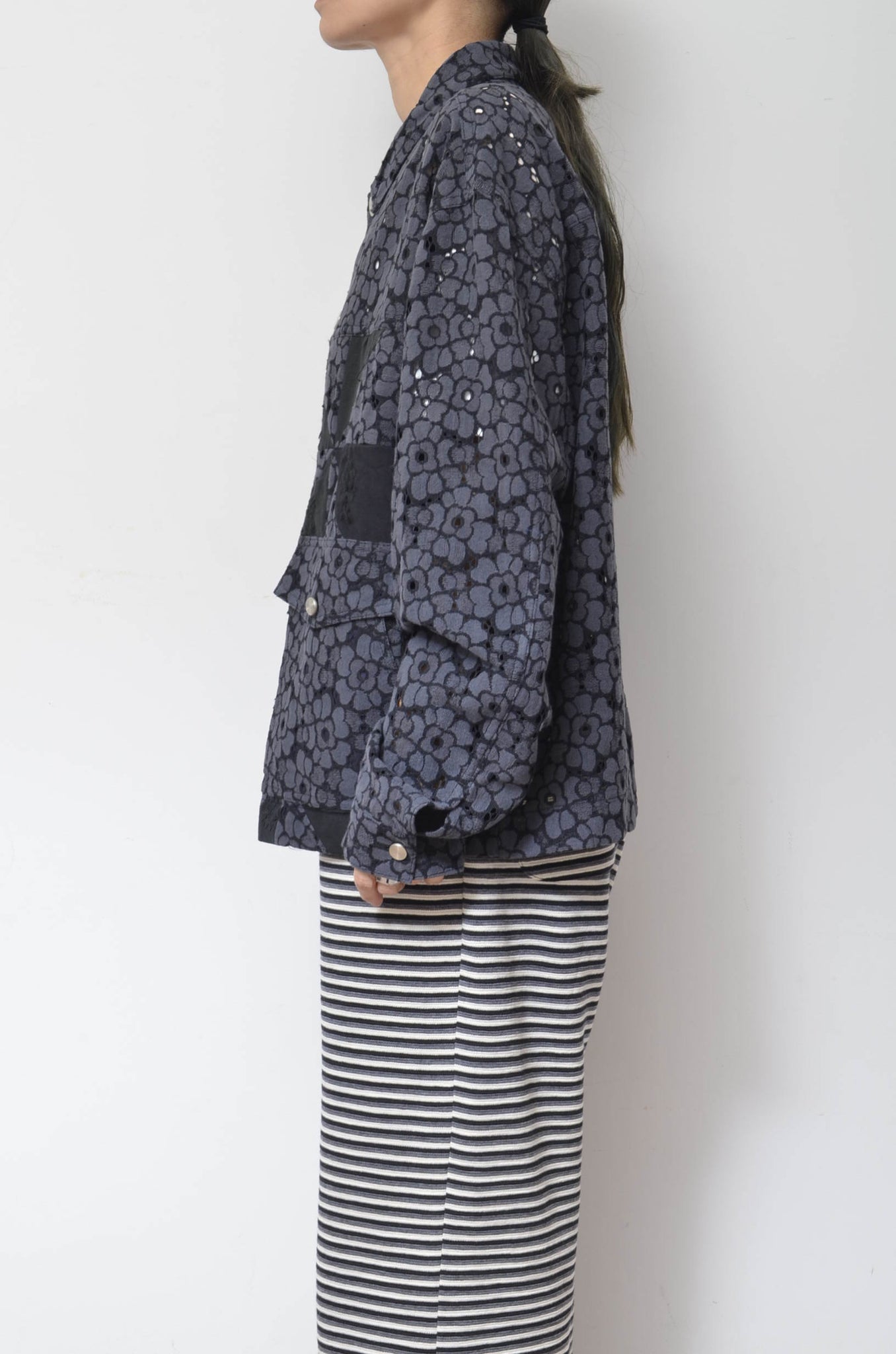 程よく厚みがありシックな風合いで織り上げられたデッドストックの花がらのレース生地で仕立てたワークブルゾン。