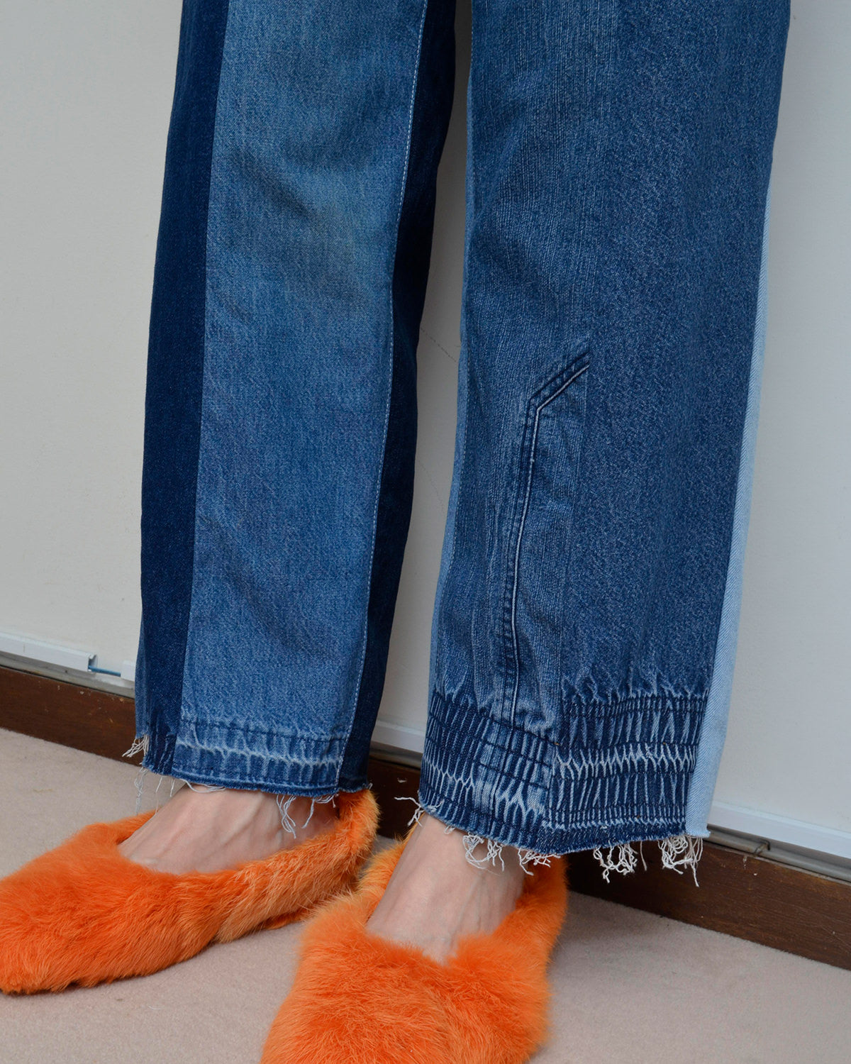 usedイージーパンツを解体・再構成し、ウエストゴムの痕跡を活かした独自のパネルワークがポイント。